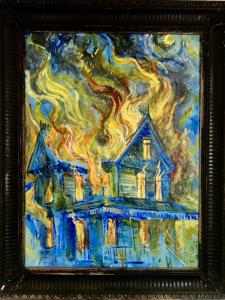 Fire lifts from the house in long, uncontained spirals, drawn upward rather than outward. The structure still stands, but its interior has found a way to speak past the walls. What rises is not destruction—it is pressure finally given air.